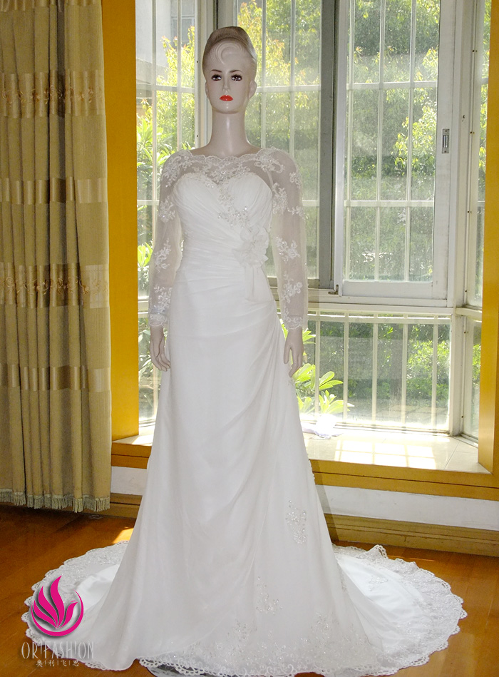 Handmade modest chiffon wedding dress, elegant A-line style gown features a charming illusion lace top and long sleeves, delicate lace appliques and Swarovski crystals highlight the bateau neckline and the long sleeves, the unique beauty of this gown is the illusion back design, modest but sexy, asymmetric pleated design bodice is accented with luscious handmade flowers, matching lace appliques embellish the bottom of the dress and the chapel length train. |