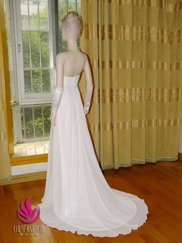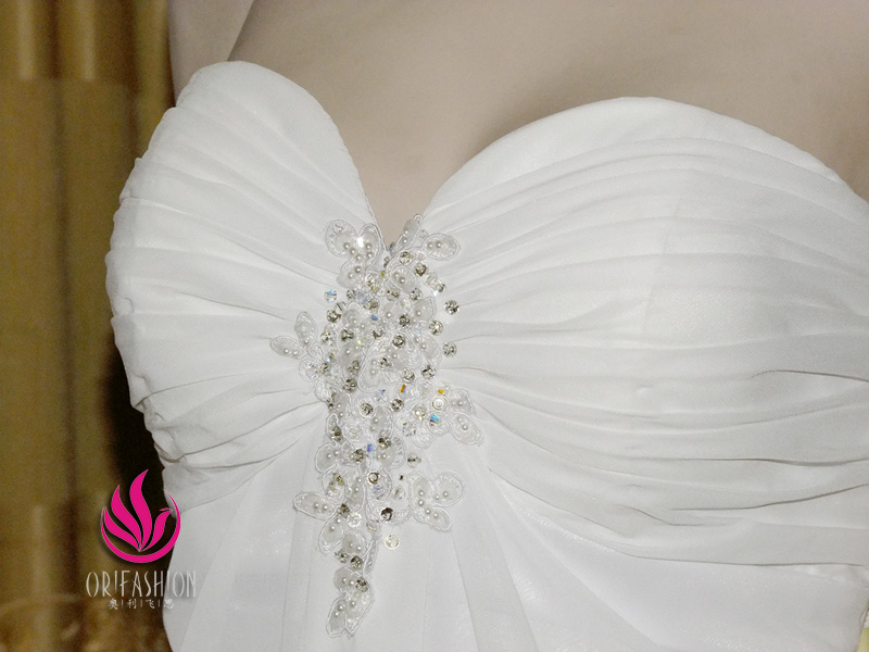 Handmade silk chiffon wedding dress, fairy strapless slim A-line style with elegant sweep train, creating a simple but attractive sense, delicate hand-beaded lace appliques adorn the pleated bust, sparkling Swarovski crystal detail highlight the charming sweetheart neckline, matching appliques embellish the back of the waist. |