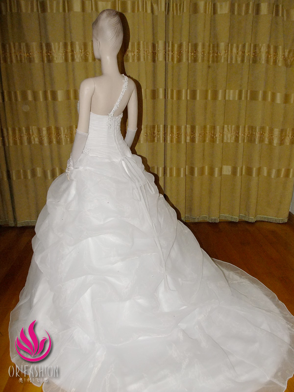 Handmade silk organza overlay Japanese duchess satin wedding dress, unique one shoulder strap design adds charming and distinguishable feeling to this romantic ball gown, delicate hand-beaded lace appliques embellish the sweetheart neckline, the straps and the pleated midriff, pick up skirt with a chapel length train. |