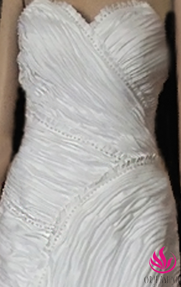 Wonderful three dimensional cutting. Romantic strapless A-Line bridal gown. Exaggerated pleated flowers embellish the skirt, portrays your love, happiness, joy and romance. Elegant slim dropped waistline, fashionable asymmetrically pleated bodice. It's your big day, you are the unique beautiful focuse of crowd!
