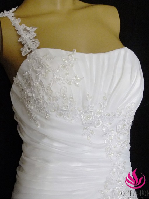 Unique and Elegant wedding dress with slim corsage and sweetheart neckline; embroidery sequins rightly adorn the bodice and then casade to the the organza layer which cover the satin under layer; distinctive design of one shoulder strap makes this dress more sense of beautiful and romantic effect .
