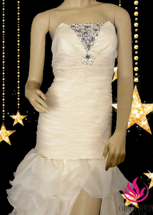 Sexy yet elegant evening/prom dress, plunging V neckline inverted with tulle panel which accented with shimmer beads and sequins, pleated bodice, exaggerative dropped waistline, front split multi-tiered organza skirt with court train, open back with criss cross straps. |