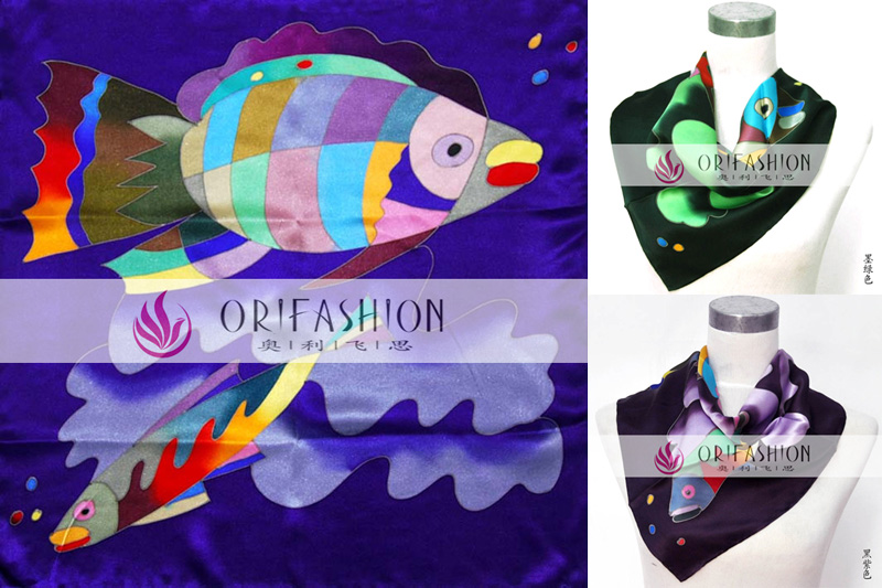 >> Hand Painted Colorful Fish Pure Silk Scarf
