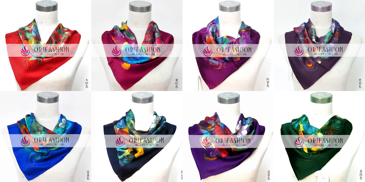 100% pure silk charmeuse fabric, delicate hand rolled hem. It measures 50cm (19.5inches) by 50cm (19.5inches) for a square scarf.