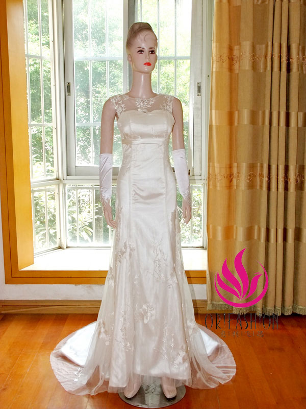 Trumpet bridal gown, soft sweetheart neckline is covered by delicate embroidered tulle, and comes with a unique sexy see-through back. Elaborate handmade flowers adorn the back of the skirt, which features a chapel length train.
